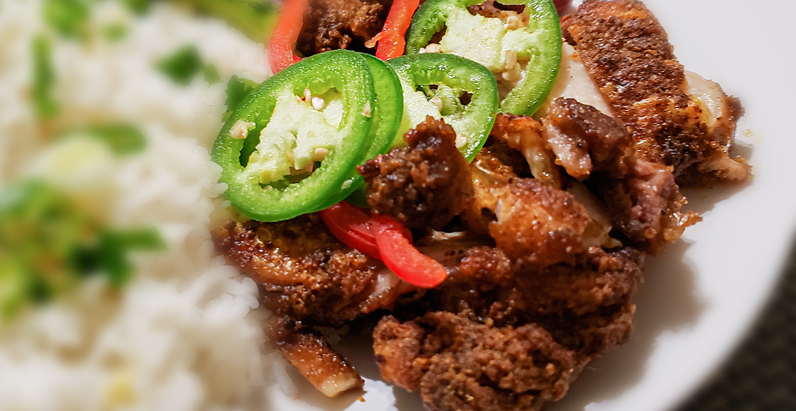 Let it rest for 10-15 minutes, and chop the chicken into bite sizes. And garnish it with red bell pepper and jalapeno served with rice.